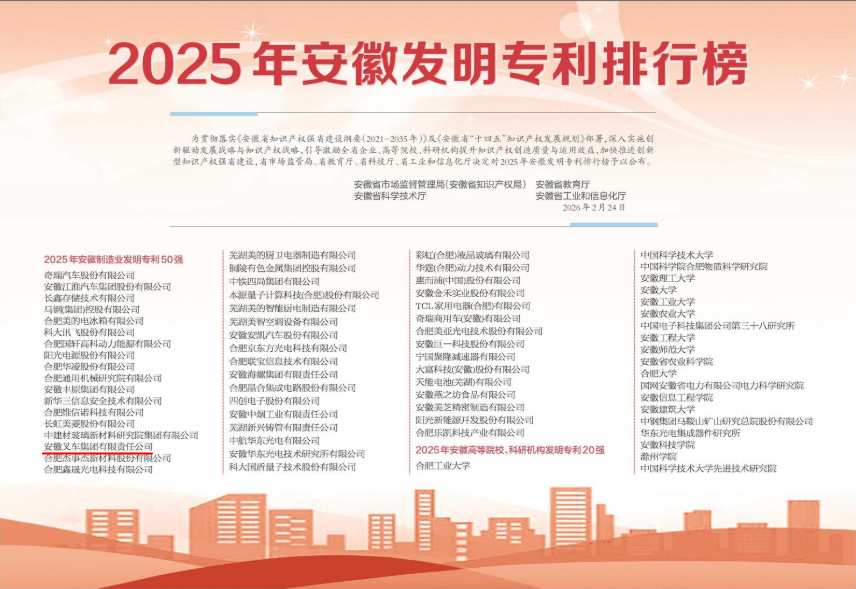 近日,安徽省市場監(jiān)督管理局(安徽省知識產(chǎn)權(quán)局)、安徽省教育廳、安徽省科學(xué)技術(shù)廳、安徽省工業(yè)和信息化廳聯(lián)合發(fā)布“2025年安徽發(fā)明專利排行榜”,安徽叉車集團(tuán)憑借卓越的創(chuàng)新能力與知識產(chǎn)權(quán)優(yōu)勢,成功入選安徽省制造業(yè)發(fā)明專利50強(qiáng)。   作為工業(yè)車輛行業(yè)的...